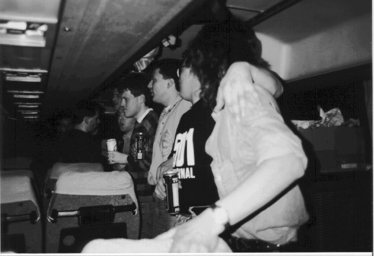 So weit so gut. So gegen 3 Uhr morgens legten wir eine erste Rast in Wörnitz ein. Kaum raus aus dem Bus, den ersten Schnee gesichtet und schon ging die SchneeballSchlacht los. Steve verlor dabei fast sein Augenlicht, oder war es der Alkohol der ihn so trüb dreinblicken ließ? Auch wurde hier schon die ersten Gunstgeschenke“ für die holde Weiblichkeit“ gekauft. Joe : “Kerstin, die Kuh hab' ich für dich gekauft“. Eine wirklich entzückendes Tierchen. Mit Glöckchen und auf unsanften Druck ertönte ein Zartes : “Muuuuh', daß auch Stunden später im Bus noch zu hören war. Dach da Kerstin das Geschenk verschmähte, mußte das arme Tier Zunächst mit der Ablage im Bus vorlieb nehmen. Wie grausam ist die Menschheit !! Die Bediensteten des Rasthofes waren jedenfalls froh das die Rasselbande so um 3 Uhr den Saal verließ.